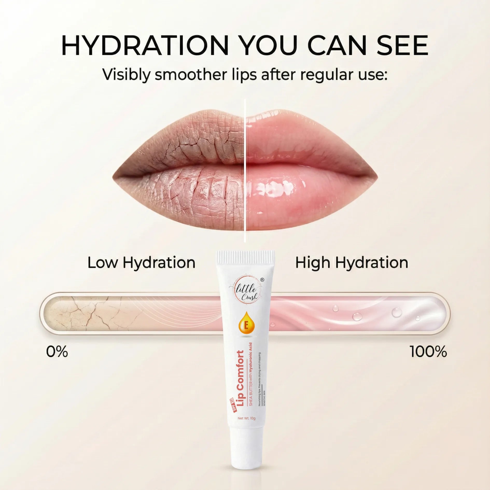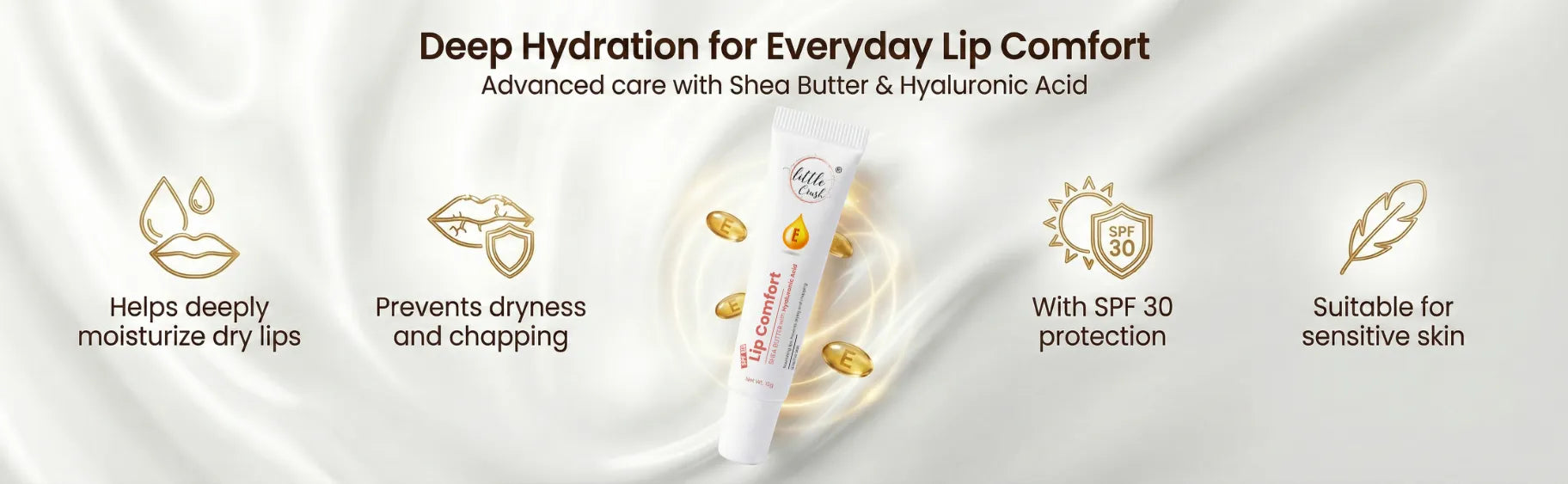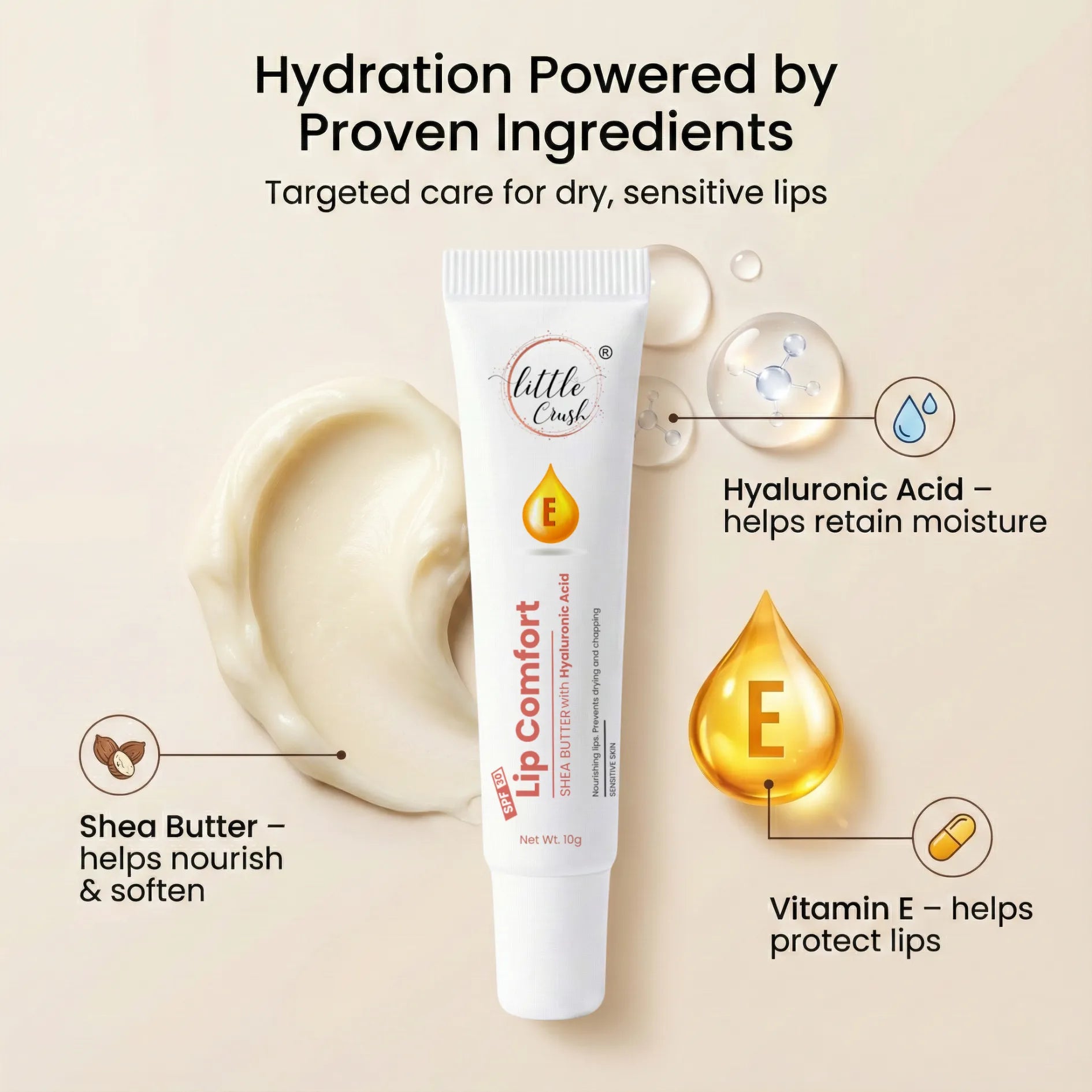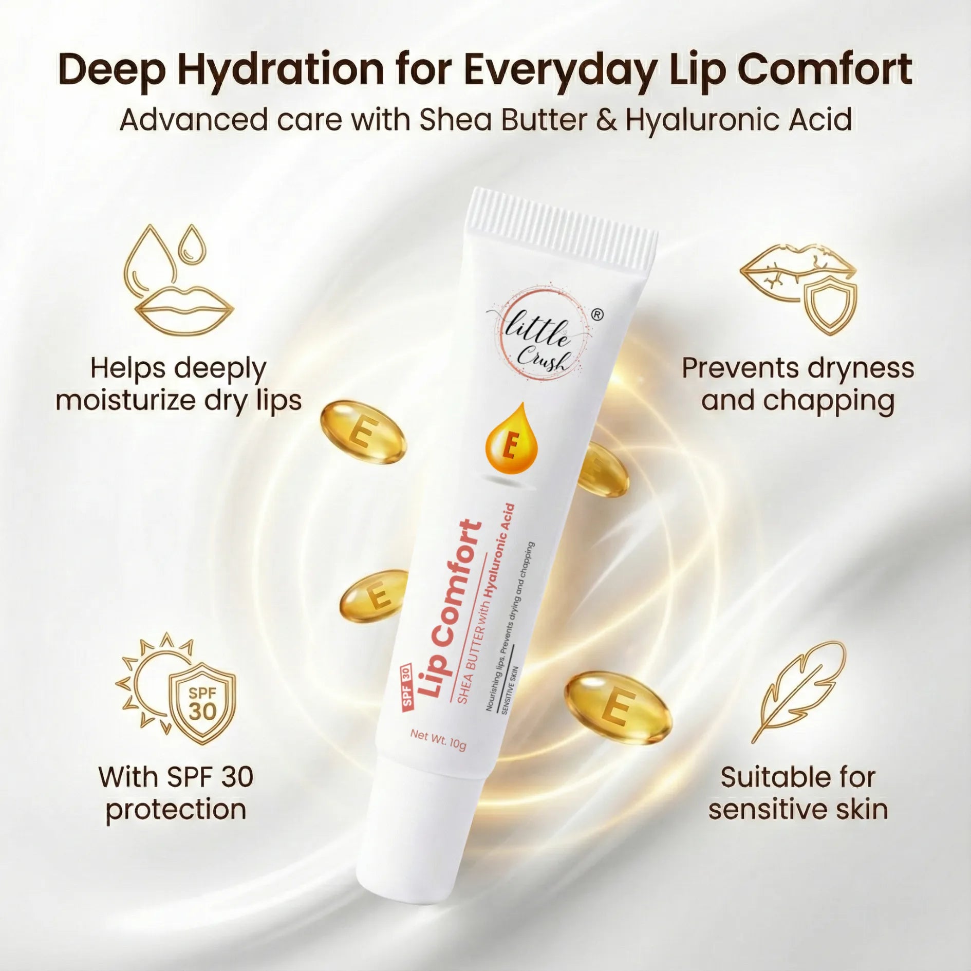 Little Crush Lip Comfort delivers professional-grade hydration with a scientifically formulated blend of Shea Butter and Hyaluronic Acid that penetrates deep to restore moisture and combat dryness. Enriched with Vitamin E, this protective balm conditions sensitive lips while shielding against environmental stressors and UV damage with SPF 30 broad-spectrum coverage....
